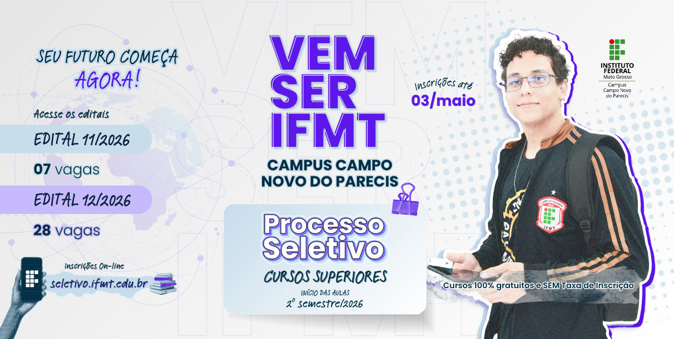 O Instituto Federal de Educação, Ciência e Tecnologia de Mato Grosso (IFMT) está com inscrições abertas para o processo seletivo de cursos presenciais de graduação com ingresso no segundo semestre de 2026. No Campus Campo Novo do Parecis, são ofertadas vagas para o curso de Bacharelado em Agronomia, com aulas no período noturno.